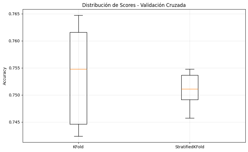 Conclusión: StratifiedKFold es MÁS ESTABLE (menor variabilidad: 0.32% vs 0.89%)