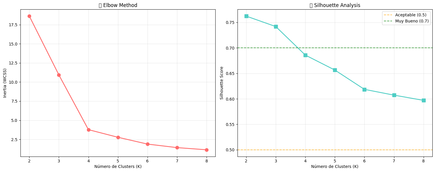 Clustering con K-Means: - Búsqueda del K óptimo con Elbow Method y Silhouette Analysis - Entrenamiento del modelo final - Análisis de perfiles de clientes por cluster