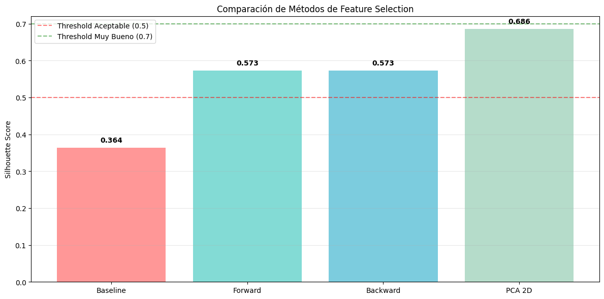 Comparación de Silhouette Scores entre diferentes métodos de reducción dimensional. PCA con 2 componentes logra el mejor score (0.686), superando significativamente a Forward Selection y Backward Elimination (ambos con 0.573) y al baseline sin reducción (0.364). Esto demuestra que PCA captura mejor la estructura de clusters en los datos al crear componentes que maximizan la varianza.