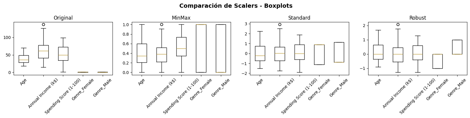 Comparación visual de tres métodos de escalado mediante boxplots. MinMaxScaler transforma los datos al rango [0,1] manteniendo la distribución original. StandardScaler centra los datos en 0 con desviación estándar de 1. RobustScaler es similar a StandardScaler pero más resistente a outliers. Los boxplots muestran cómo cada método afecta la distribución de las variables.
