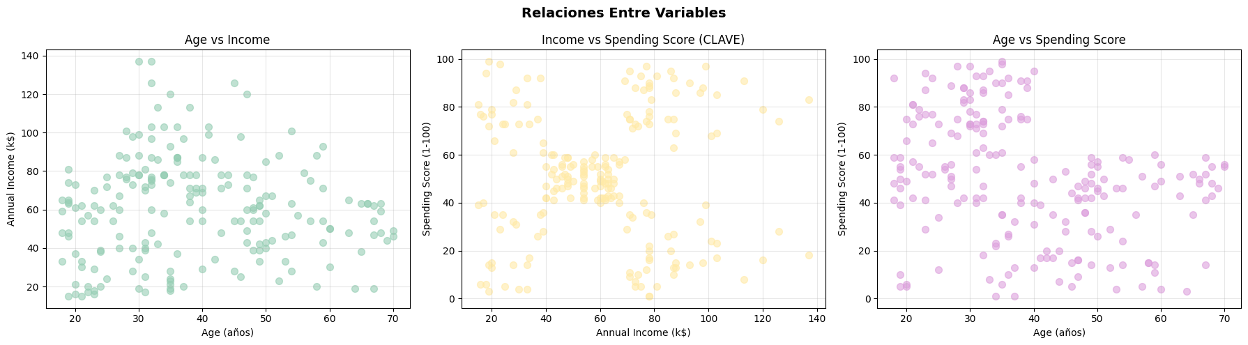 Scatter plots mostrando relaciones entre pares de variables. Se identifican patrones interesantes: clientes con alto Annual Income pueden tener Spending Score bajo o alto (dos grupos distintos), y existe cierta relación entre Age y Spending Score donde clientes más jóvenes tienden a gastar más.