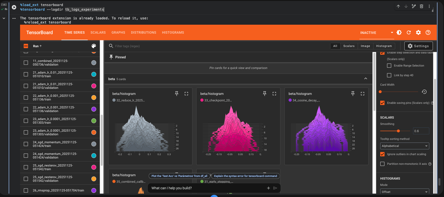 TensorBoard mostrando la comparación de loss y accuracy entre múltiples experimentos. Cada línea de color representa un experimento diferente, permitiendo identificar visualmente cuáles configuraciones convergen mejor.