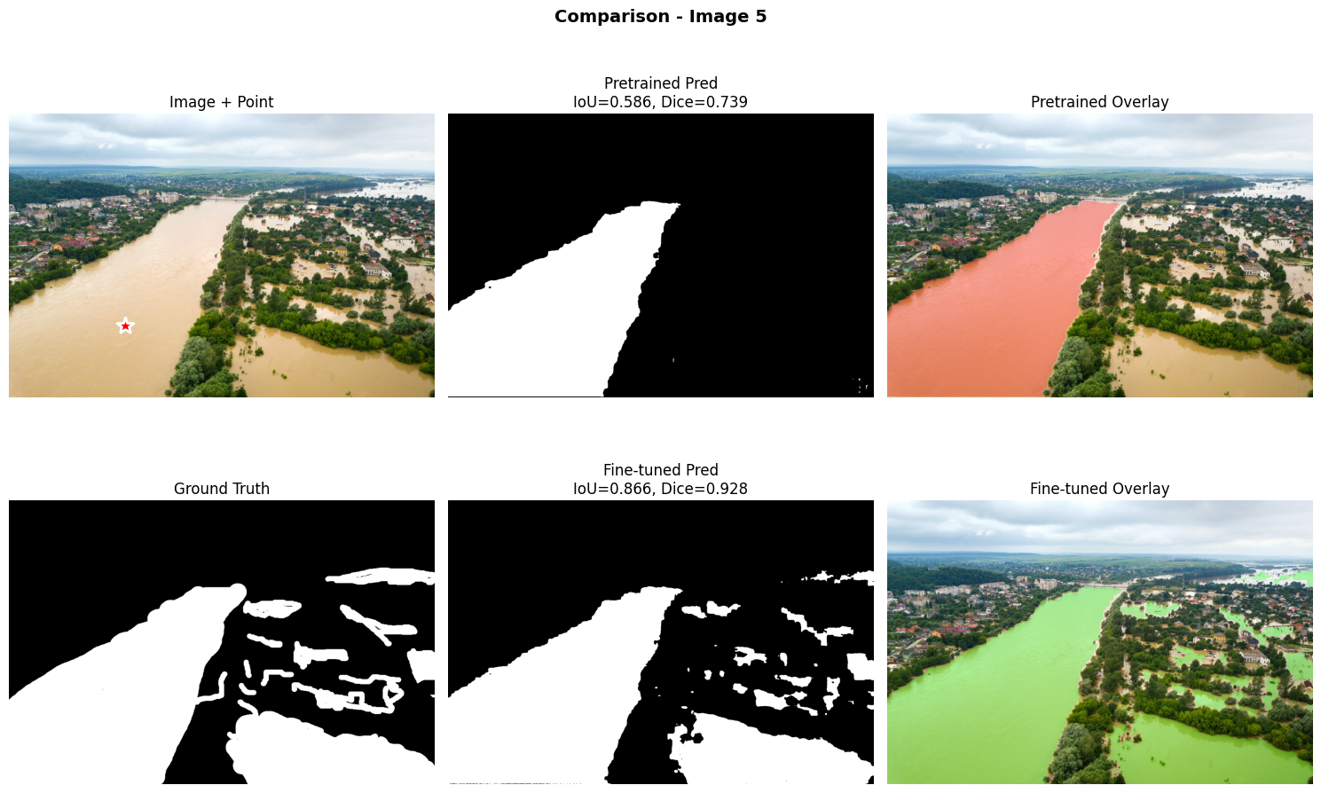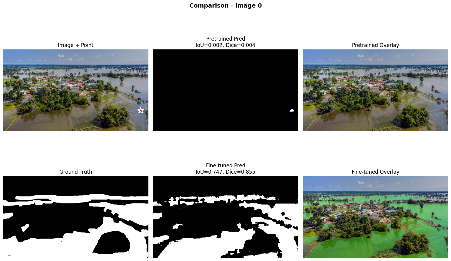 SAM preentrenado en SA-1B tiene capacidad de segmentación general muy buena, pero para dominios específicos como flood detection es insuficiente. El fine-tuning con solo 80 imágenes logra una mejora de mas del 40% demostrando la eficiencia del transfer learning, y entrenar únicamente el 4.3% de los parámetros preserva la generalización mientras especializa el modelo. Los foundation models son excelentes puntos de partida, pero la especialización es necesaria para aplicaciones críticas.