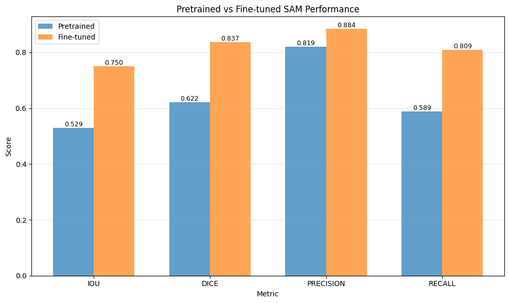 Gráfico de barras comparando las cuatro métricas principales entre modelo pretrained (azul) y fine-tuned (naranja). Se observa mejora consistente en todas las métricas, siendo Recall la que muestra mayor incremento absoluto , seguida de IoU y Dice.